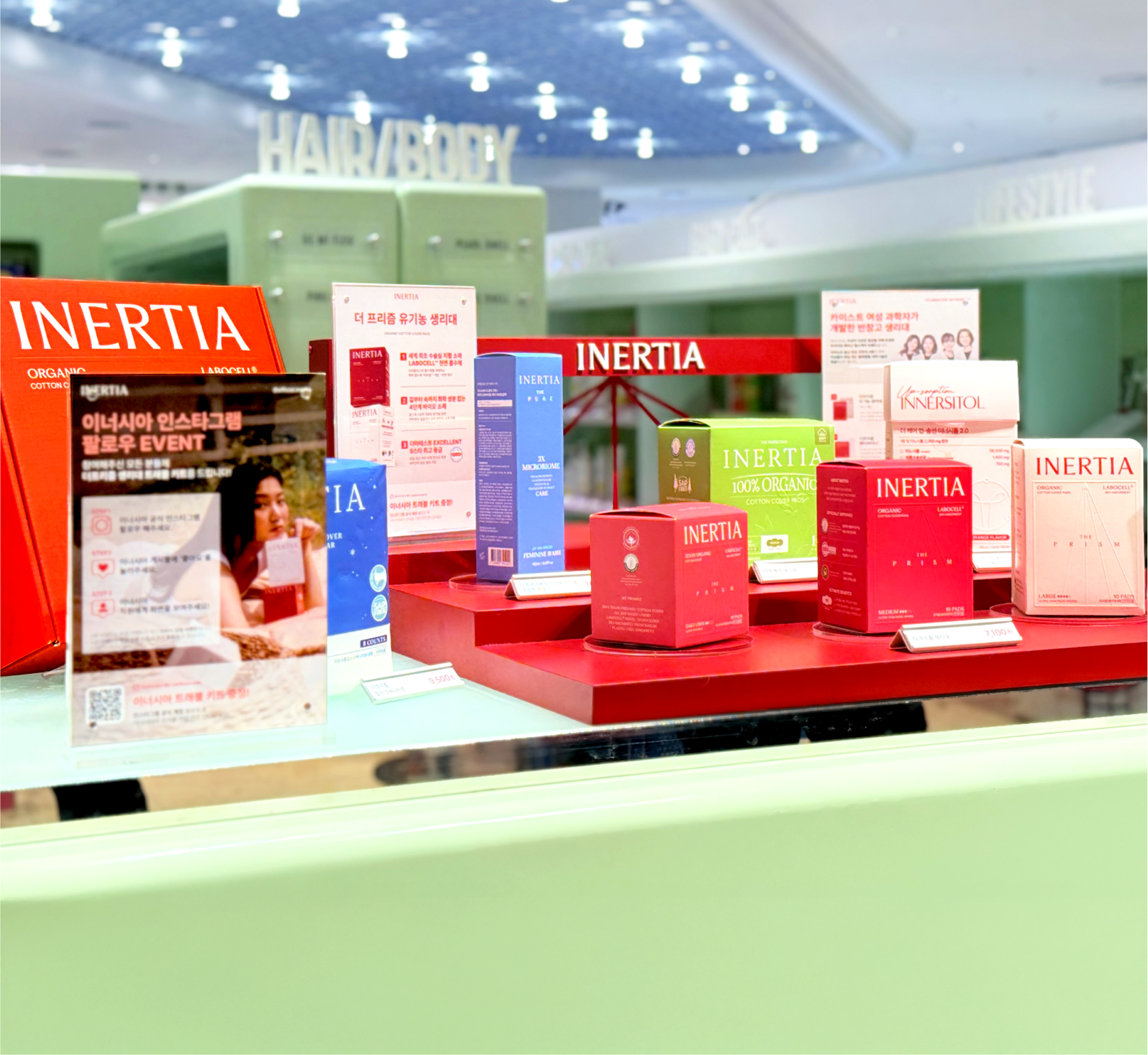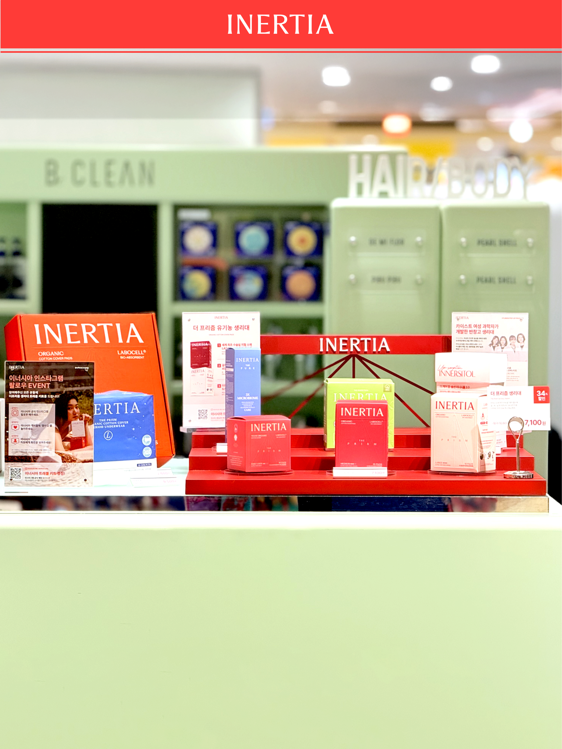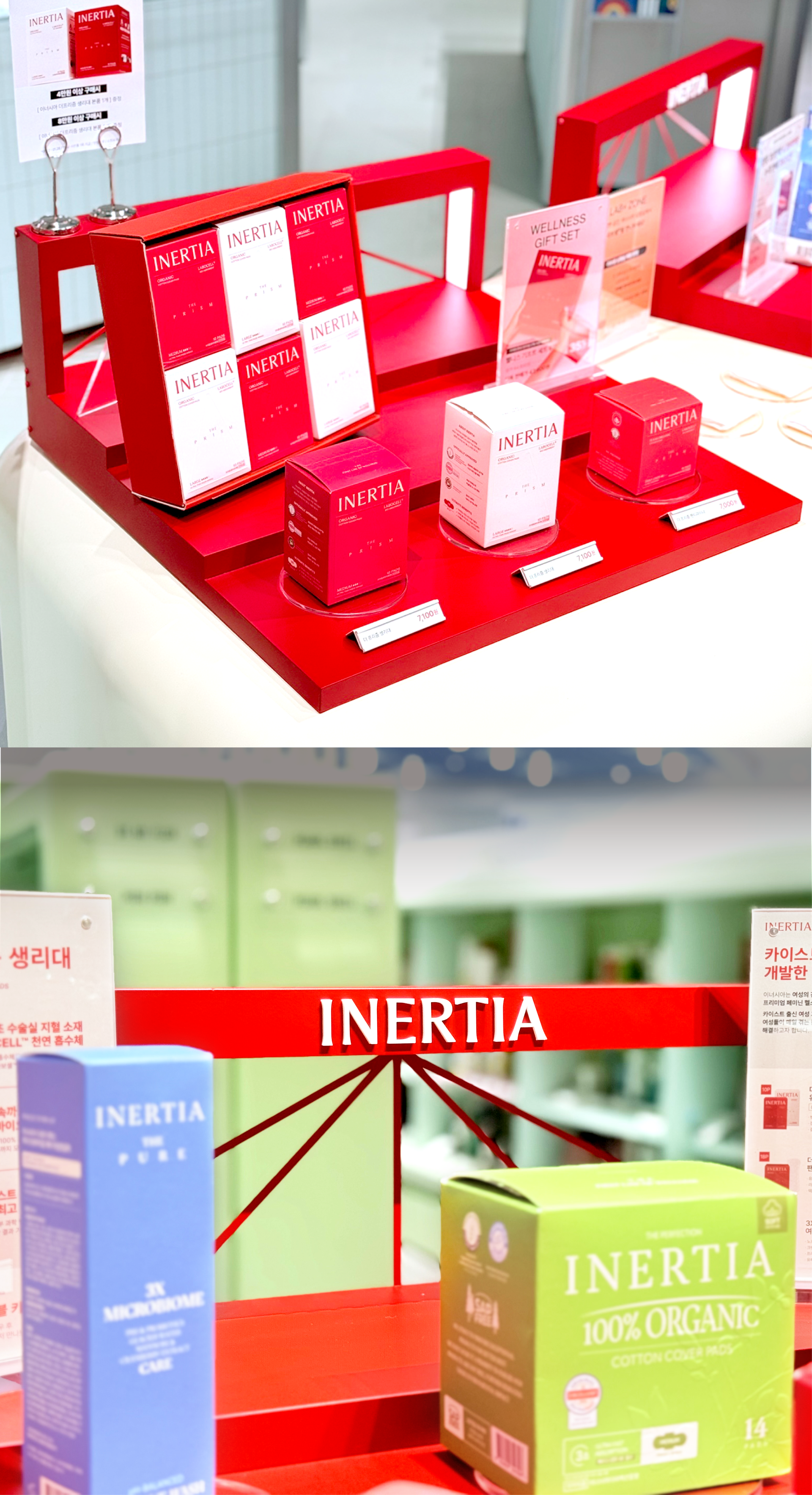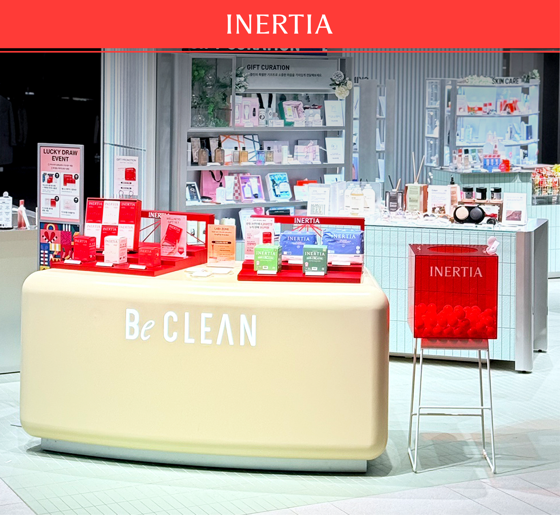 The INERTIA pop-up store was designed as a project that translates the brand’s long-standing values of cleanliness and refined standards through spatial structure and flow, rather than visual ornamentation. Despite the use of a strong color palette, the space was carefully calibrated through the balance of tone, surface area, and negative space to avoid excess. Centered around INERTIA’s signature red, the design prioritizes simple structures and clear planning over elaborate displays, allowing the products and their messages to emerge naturally. The overall circulation of the pop-up was conceived as a continuous sequence, guiding visitors to understand the brand step by step—from entry, to display, information, and hands-on experience. Visual noise was intentionally minimized, and spatial elements such as height, display tiers, and spacing were repeatedly adjusted to ensure that attention remains focused on the products and brand messaging. The central counter and structured display system establish a clear spatial anchor, enabling visitors to intuitively recognize the characteristics of each product group and the distinctions within the lineup. At the same time, the design maintains a cohesive brand impression, ensuring that individual products are perceived not in isolation, but as part of INERTIA’s unified standard.