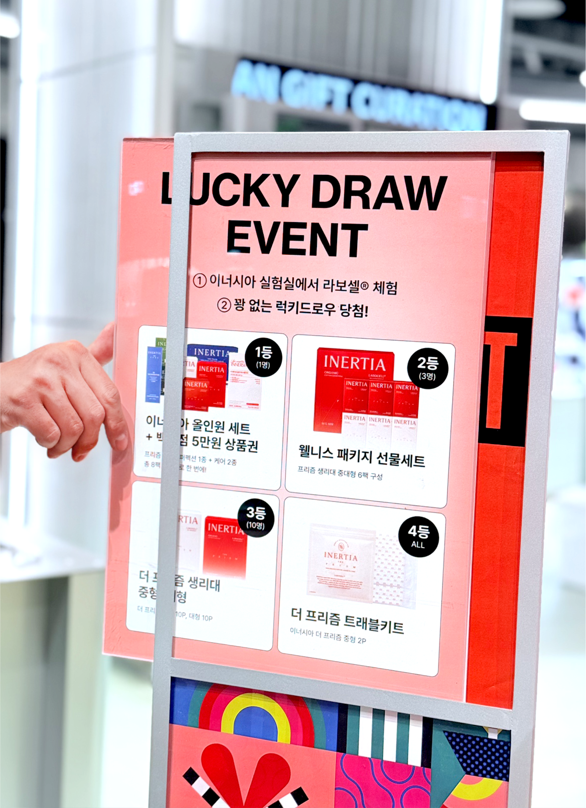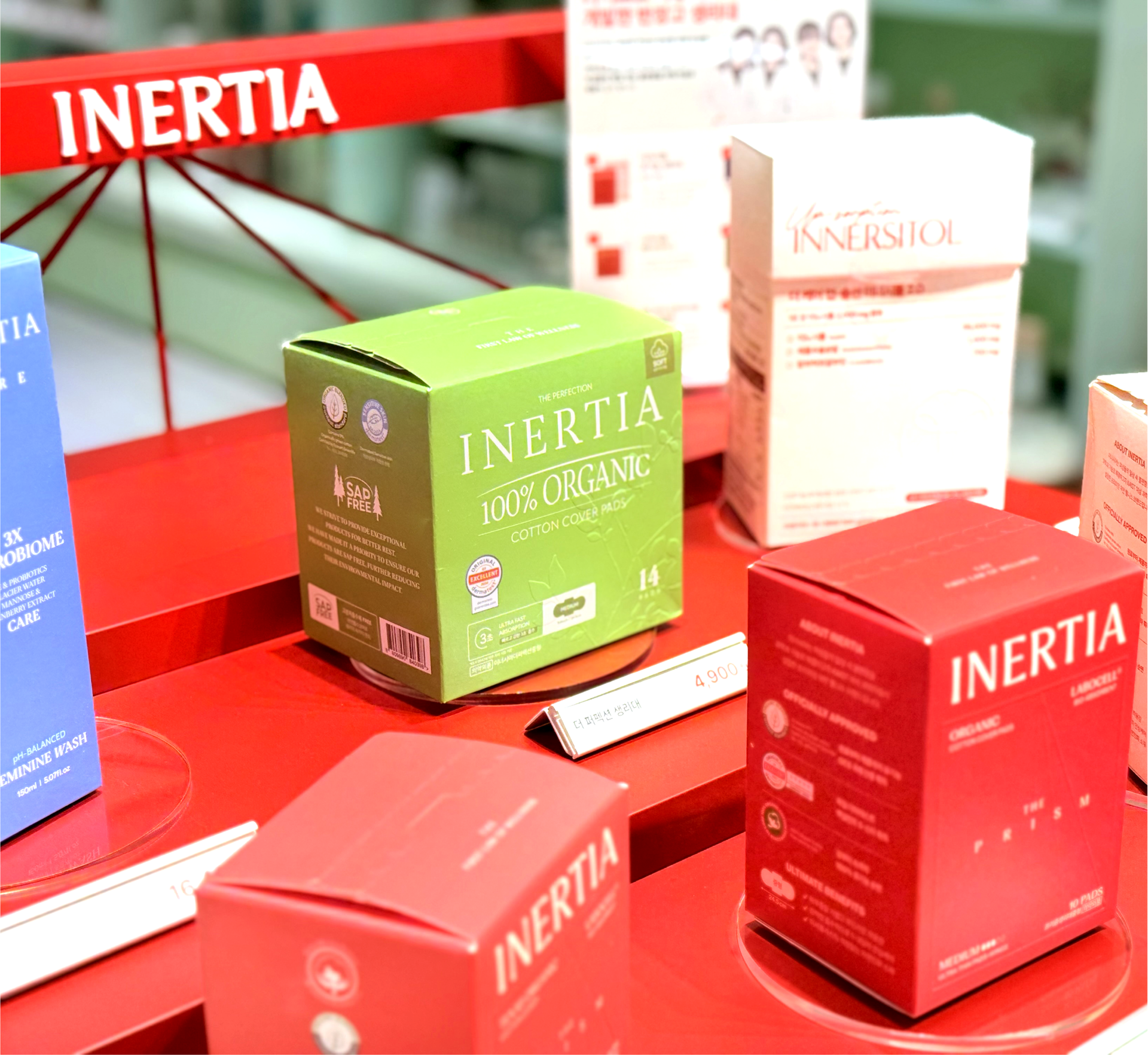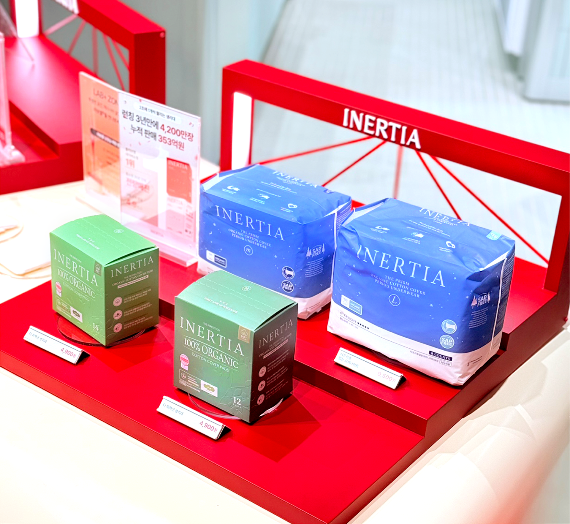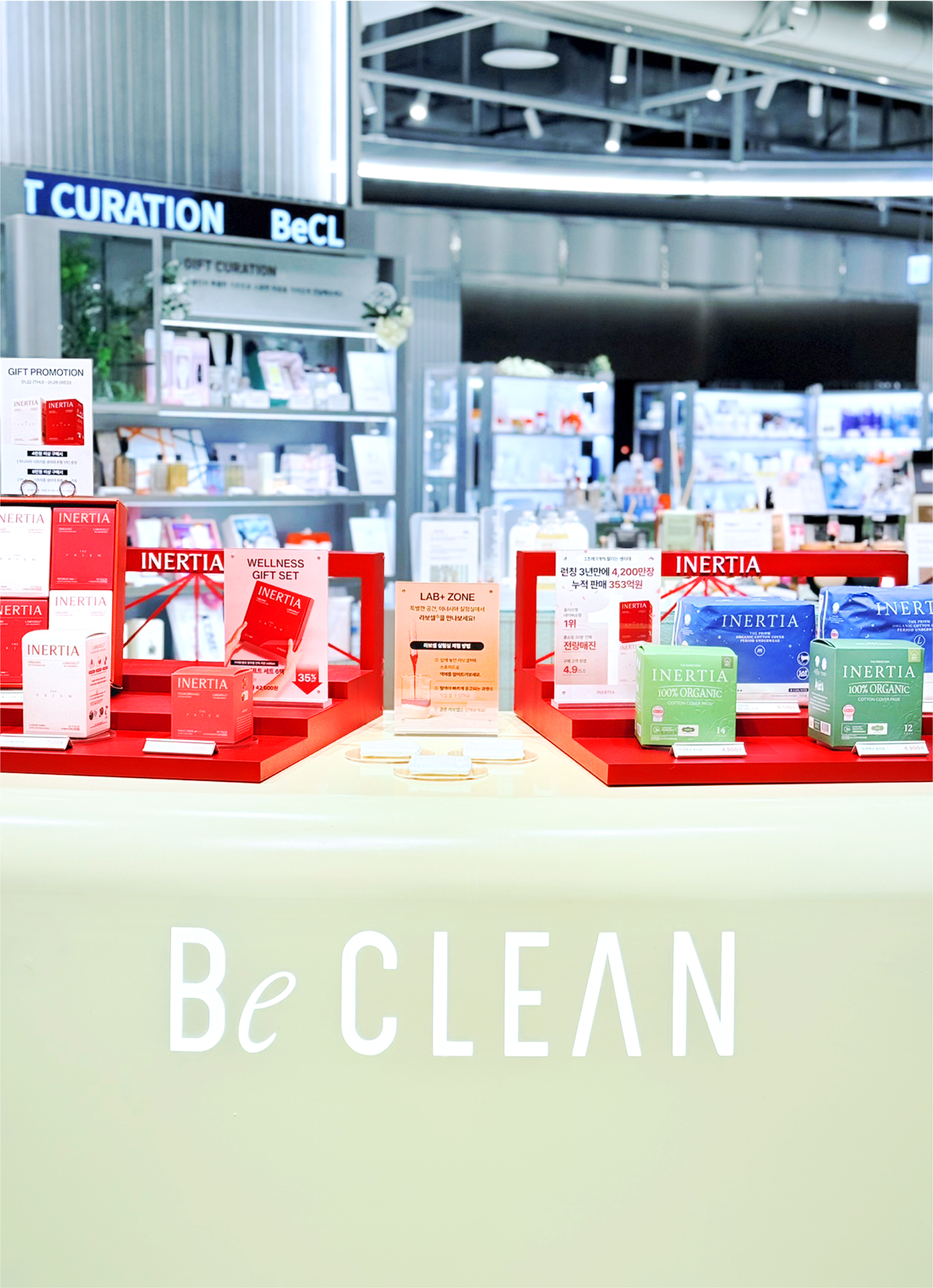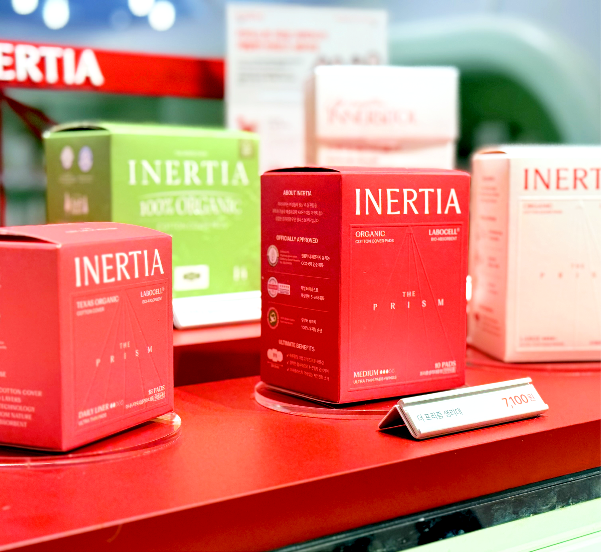 The INERTIA pop-up store was designed as a project that translates the brand’s long-standing values of cleanliness and refined standards through spatial structure and flow, rather than visual ornamentation. Despite the use of a strong color palette, the space was carefully calibrated through the balance of tone, surface area, and negative space to avoid excess. Centered around INERTIA’s signature red, the design prioritizes simple structures and clear planning over elaborate displays, allowing the products and their messages to emerge naturally. The overall circulation of the pop-up was conceived as a continuous sequence, guiding visitors to understand the brand step by step—from entry, to display, information, and hands-on experience. Visual noise was intentionally minimized, and spatial elements such as height, display tiers, and spacing were repeatedly adjusted to ensure that attention remains focused on the products and brand messaging. The central counter and structured display system establish a clear spatial anchor, enabling visitors to intuitively recognize the characteristics of each product group and the distinctions within the lineup. At the same time, the design maintains a cohesive brand impression, ensuring that individual products are perceived not in isolation, but as part of INERTIA’s unified standard.